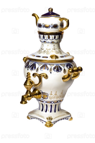 Серия: изолированная на белом: старый чайный сервис - Самовар