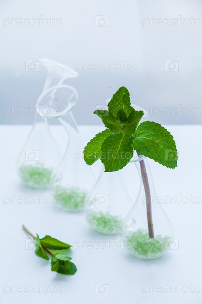 Листья зеленой мяты в стеклянной вазе на белом фоне