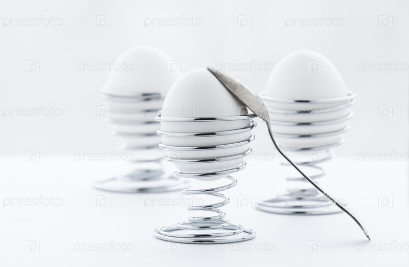 Три яйца в металлических подставках с ложкой