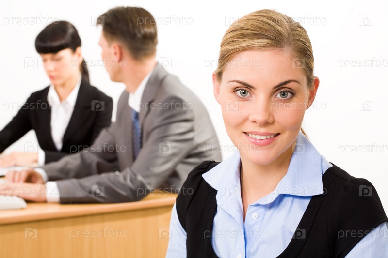 Портрет счастливой бизнес-жены, улыбающейся в камеру на фоне трудящихся
