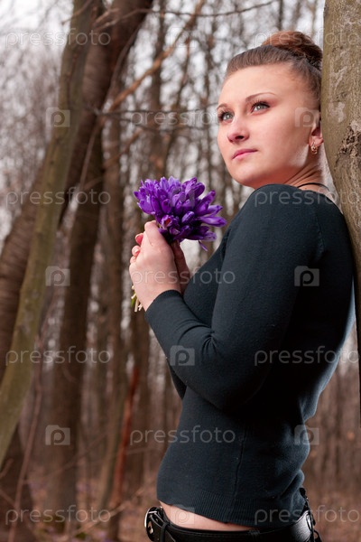 Красивая девушка с подснежниками в лесу