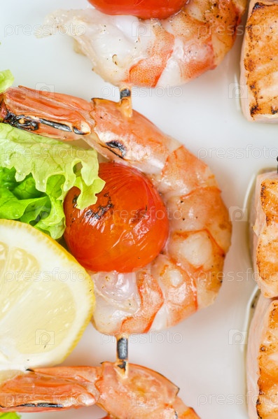 Жареные креветки и помидоры с лососем на бамбуковых палочках