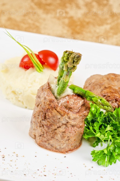 Рулеты с мясом-гриль из говядины с сыром моцарелла, ветчиной, спаржей и картофельным пюре