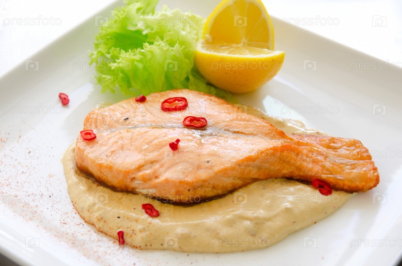 Бифштекс из лосося с зеленью, лимоном, соусом и перцем чили, приготовленный на гриле