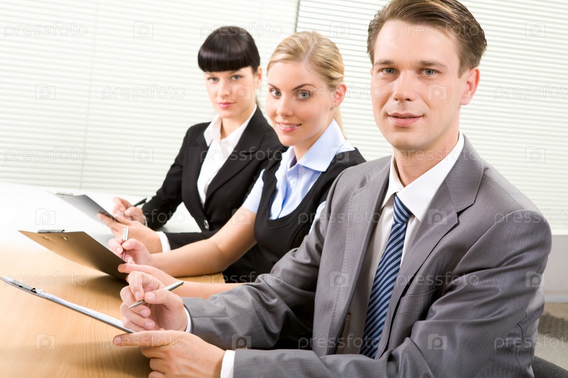 Ряд деловых людей, держащих бумаги и смотрящих на камеру