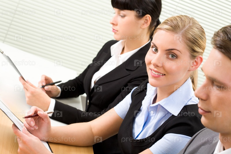 Фото бизнес-леди, держащей бумаги и смотрящей на камеру среди своих партнеров