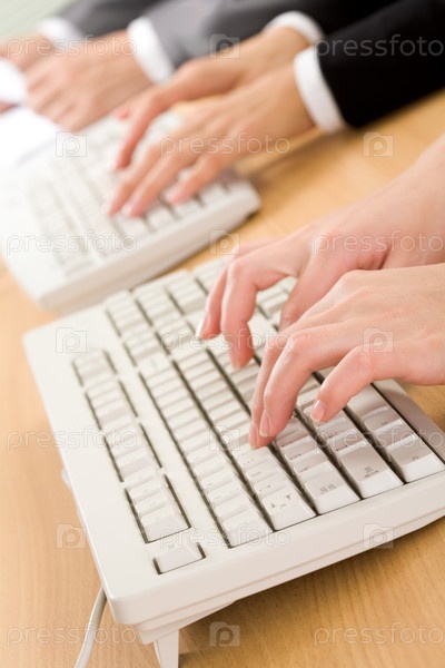 Близкий план человеческих рук, печатающих на клавиатуре во время конференции или деловой встречи