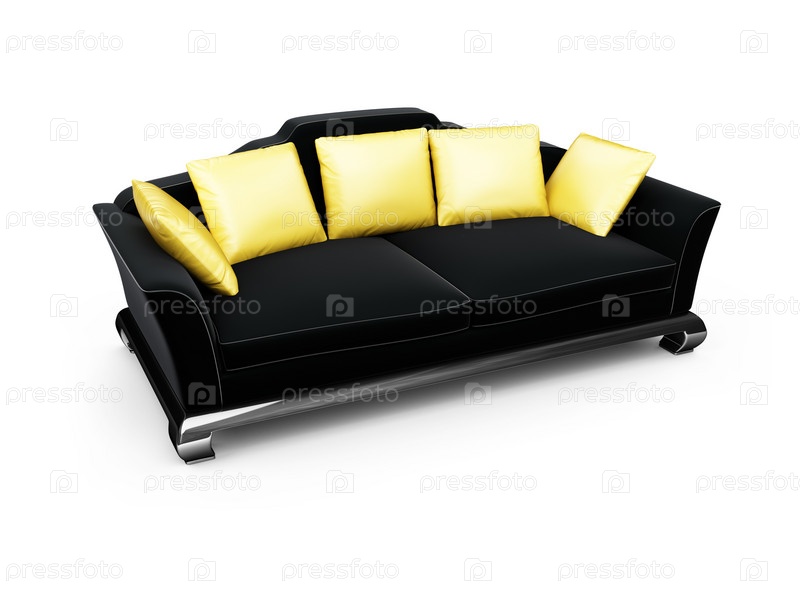 Изолированный черный диван с золотыми подушками