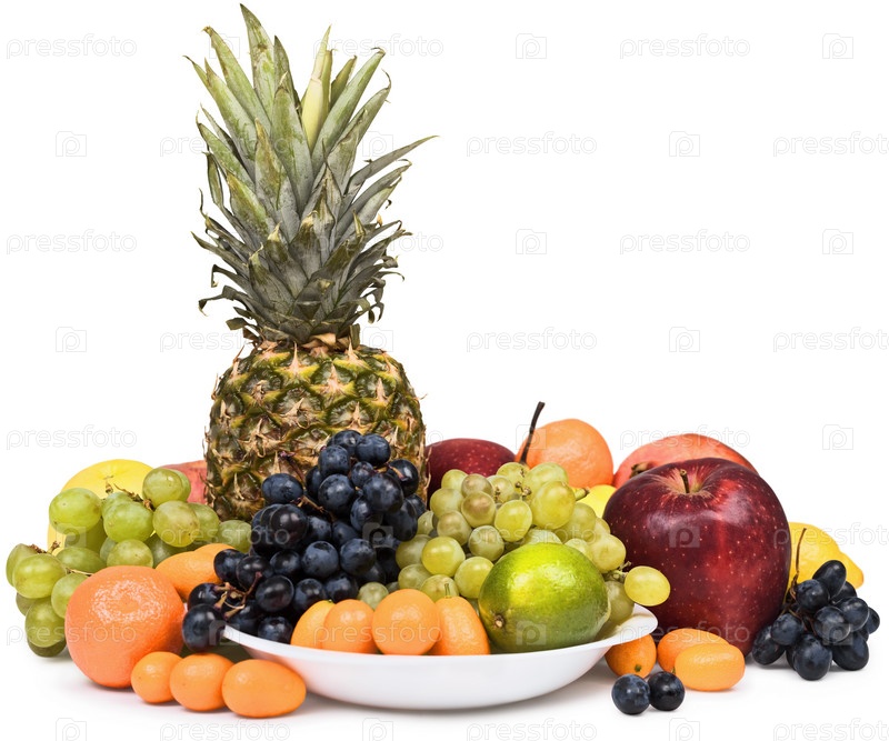 Художественная композиция из ананаса и других фруктов на белом фоне