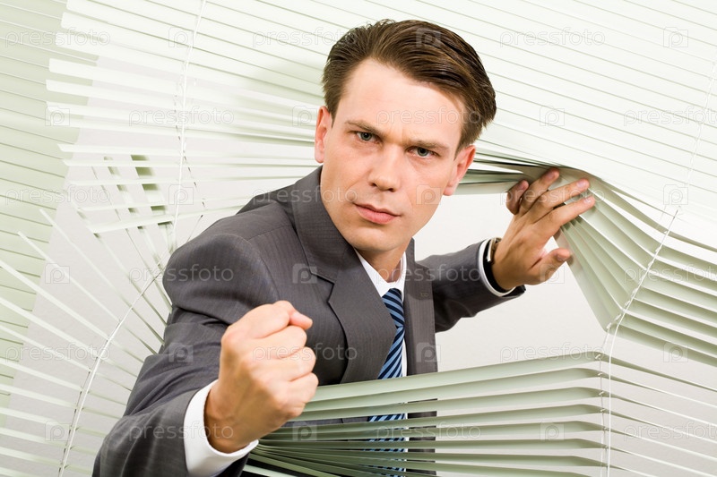 Портрет разгневанного мужчины, смотрящего на камеру из венецианского слепого и показывающего кулак