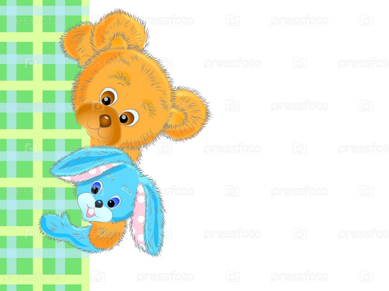 Игрушечные медведь и заяц выглядывают из-за клетчатой каймы
