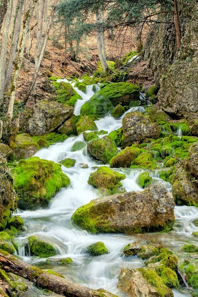 Река протекает по камням, поросшим мхом