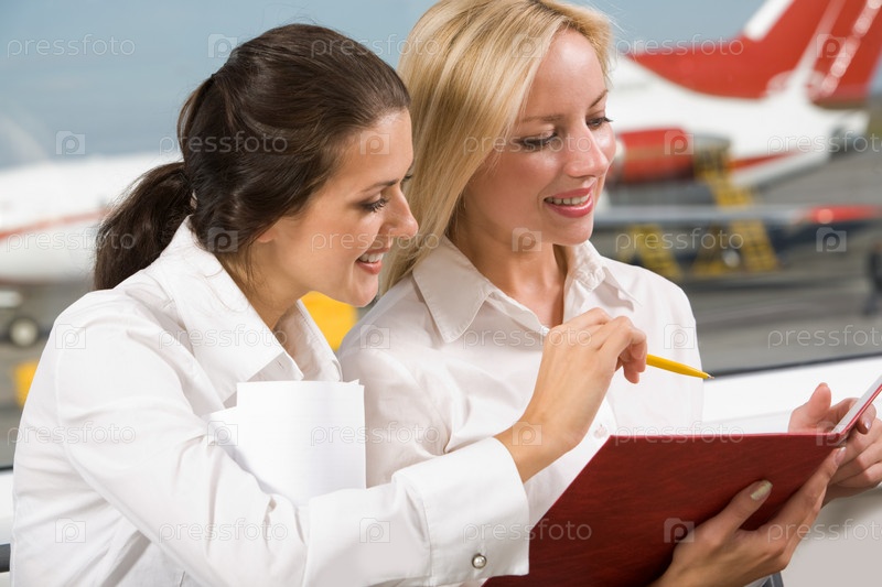 Деловая женщина демонстрирует коллеге план работы в аэропорту