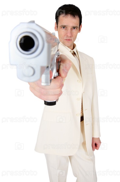 Мужчина в светлом костюме с пистолетом на белом фоне