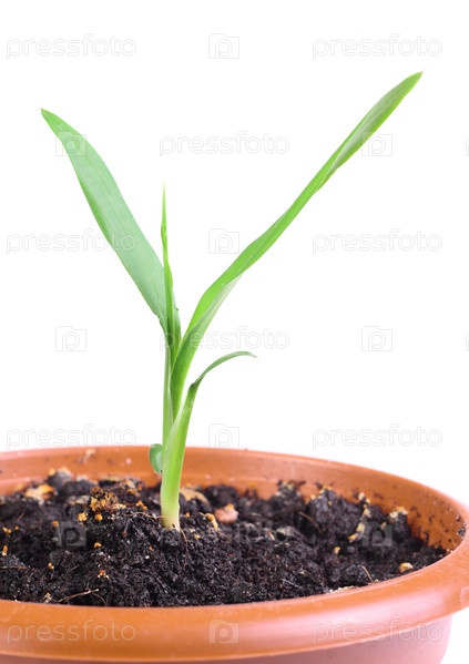 Маленький зеленый росток в горшке, изолированный на белом фоне