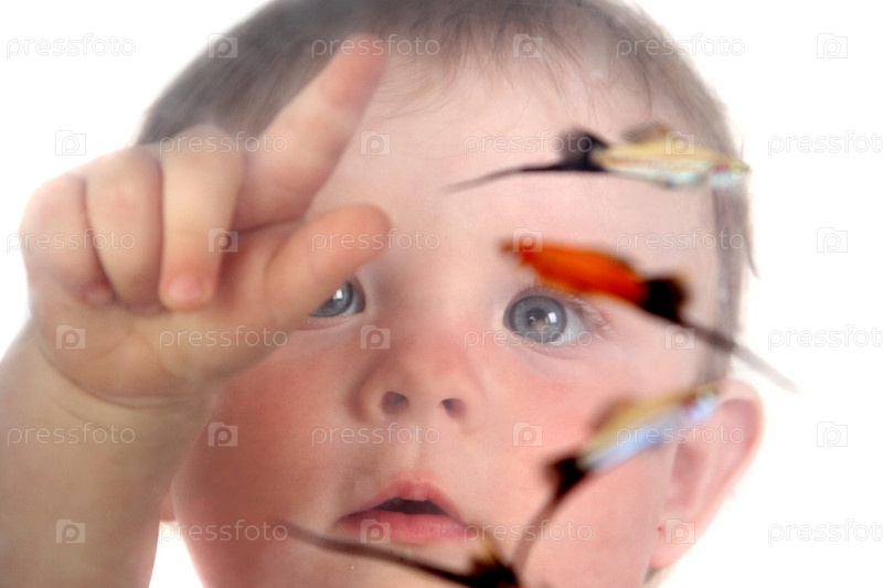 Маленькая девочка играет с аквариумными рыбками