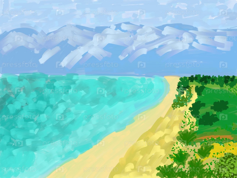 Цифровой пейзаж в стиле масляных картин. Вода, пляж и горы