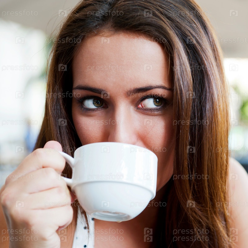 Симпатичная девушка с чашечкой кофе в летнем кафе