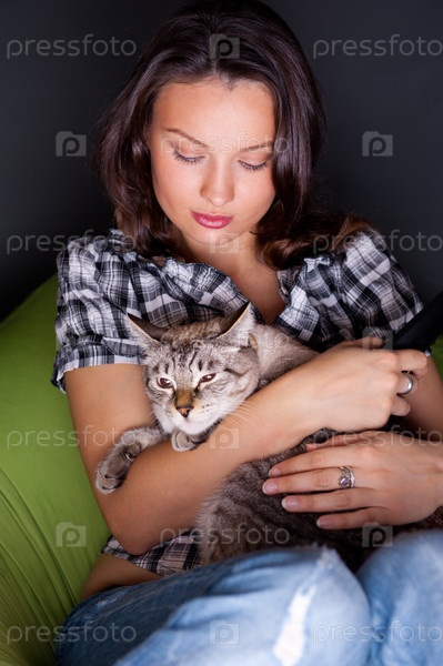 Девушка с кошкой отдыхает на бескаркасном кресле