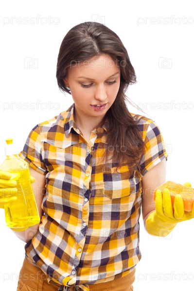 Домохозяйка с чистящим средством, изолированная на белом фоне. Концепция хозяйственных услуг