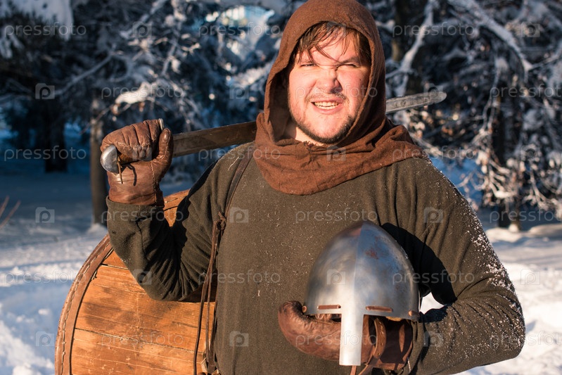 Портрет средневекового воина в зимнем лесу