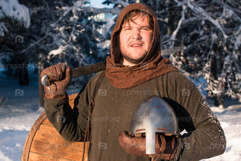 Портрет средневекового воина в зимнем лесу в исторической брони
