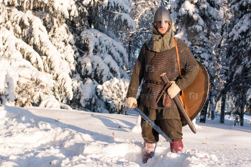 Воин в исторической броне в зимнем лесу