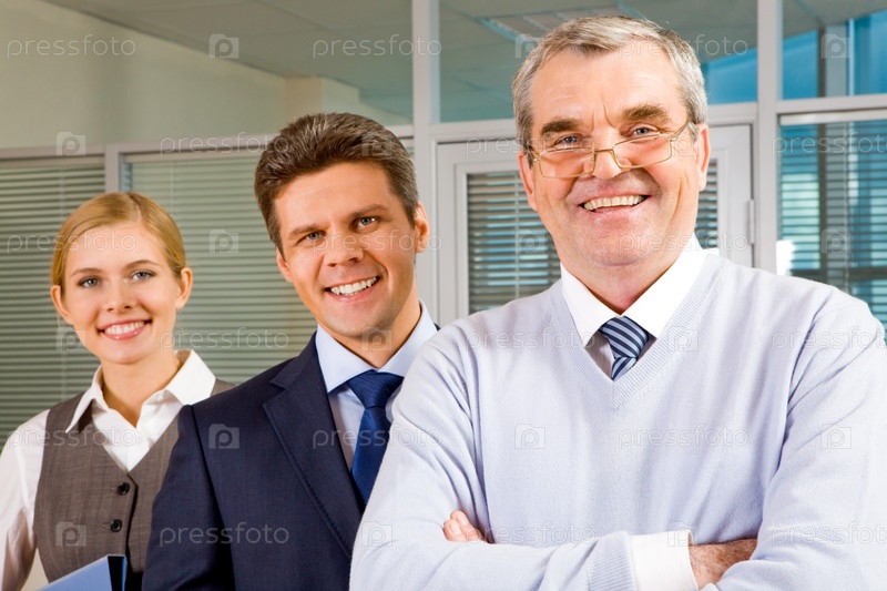 Изображение старшего лидера, улыбающегося перед камерой с двумя сотрудниками позади