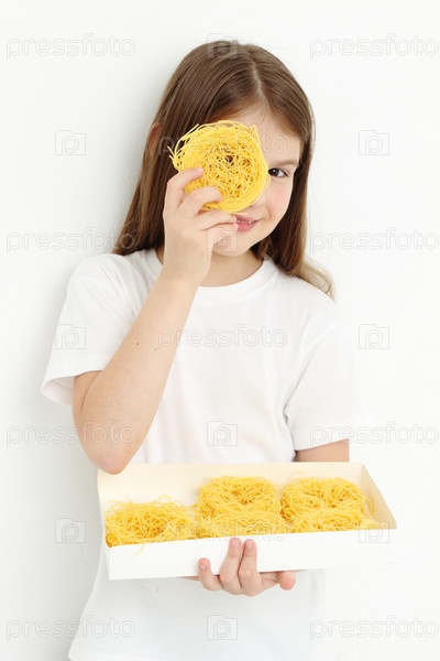 Радостная маленькая девочка с макаронами
