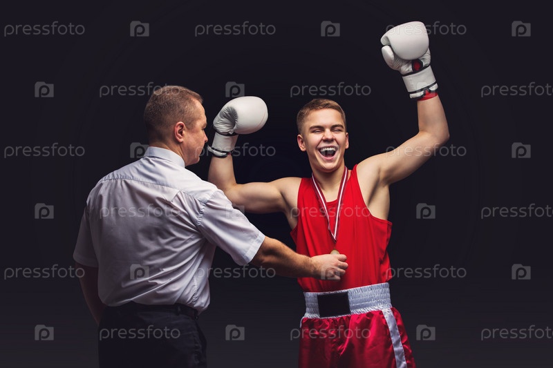 Молодой боксер с судьей