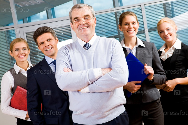 Изображение старшего лидера, улыбающегося в камеру с несколькими сотрудниками позади