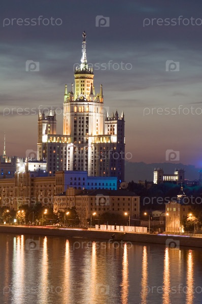 Россия. ночь Московское многоэтажное здание с освещенным