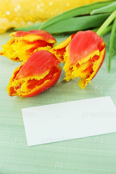Букет оранжевых тюльпанов с пустой карточкой на столе