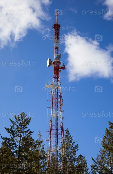 Телевизионная башня в лесу на фоне голубого неба