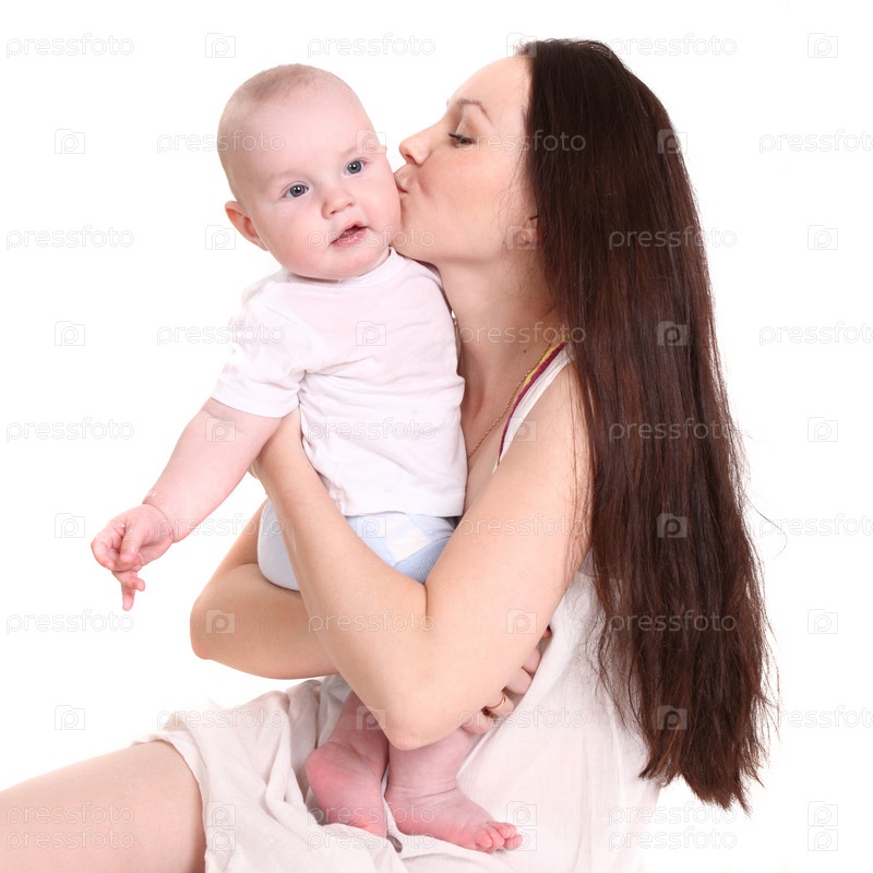 Молодая мама с сыном на белом фоне
