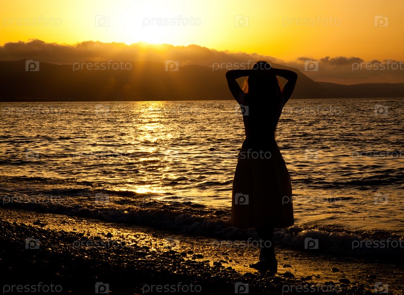 Стройная девушка наслаждается свободой, глядя на закат над морем