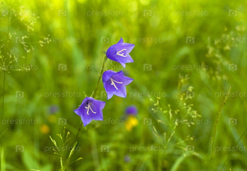 Фиолетовый полевой цветок колокольчик среди зеленой травы