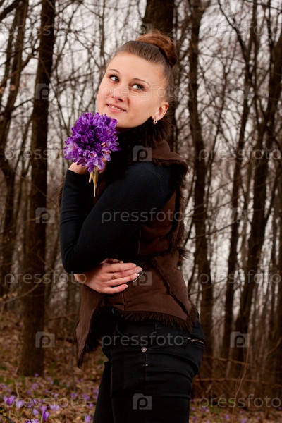 Красивая девушка с подснежниками в лесу
