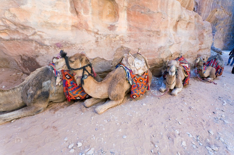 Руины древнего города Петра и верблюды бедуинов, Иордания