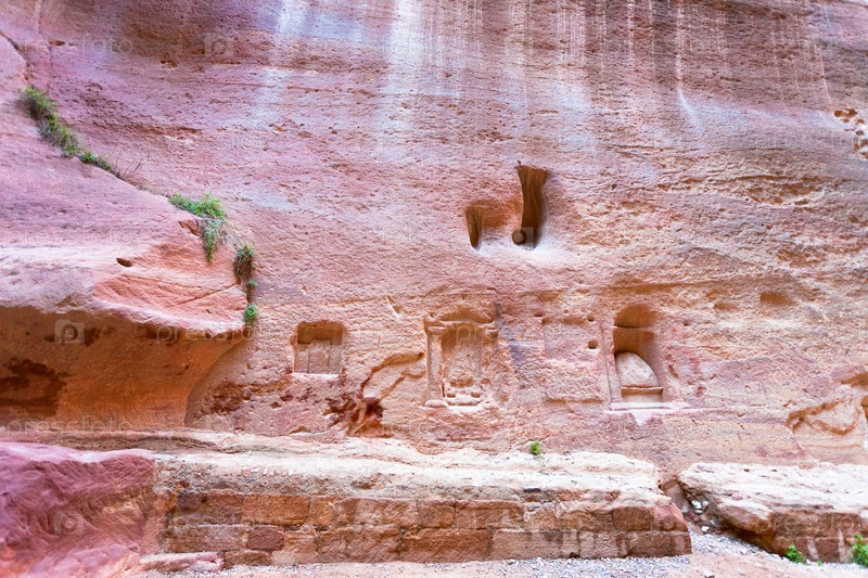 Небольшие древние набатейские ниши, храмы и рисунки в стене ущелья Сик в Петре, Иордания