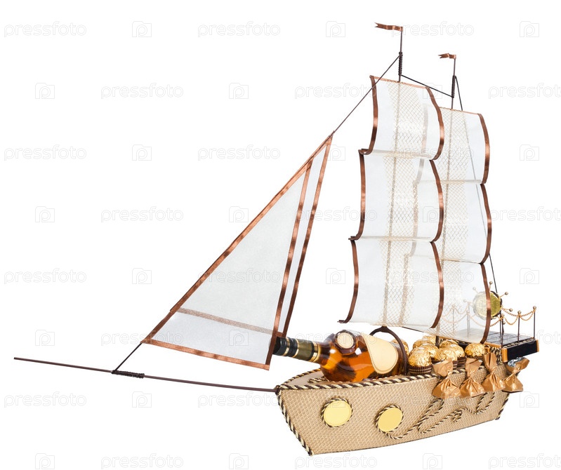 Сувенир в виде макета парусного корабля, украшенный конфетами, изолирован на белом фоне