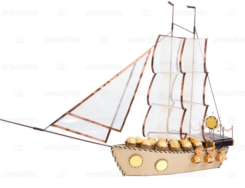 Сувенир в виде макета парусного корабля, украшенный конфетами, изолирован на белом фоне