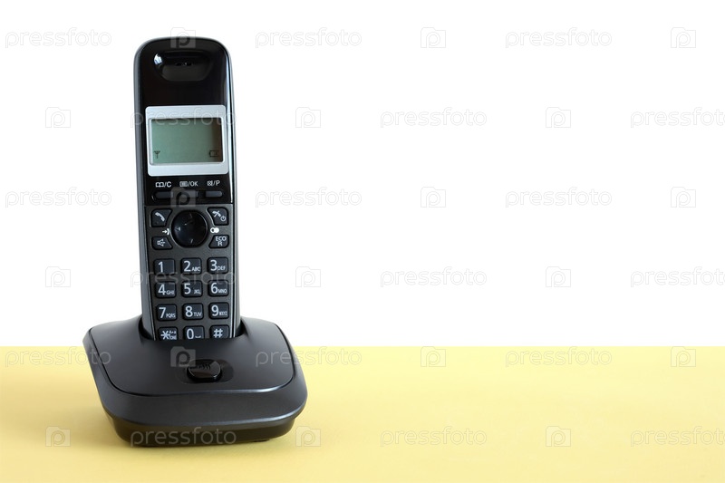 Современный черный беспроводной телефон на желтой поверхности на белом фоне. Обтравочный контур включен
