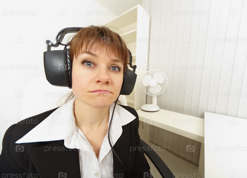 Комичная девушка в больших стерео наушниках слушает музыку