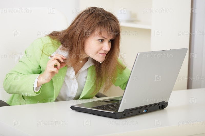 Молодая девушка угрожающе смотрит на монитор своего ноутбука