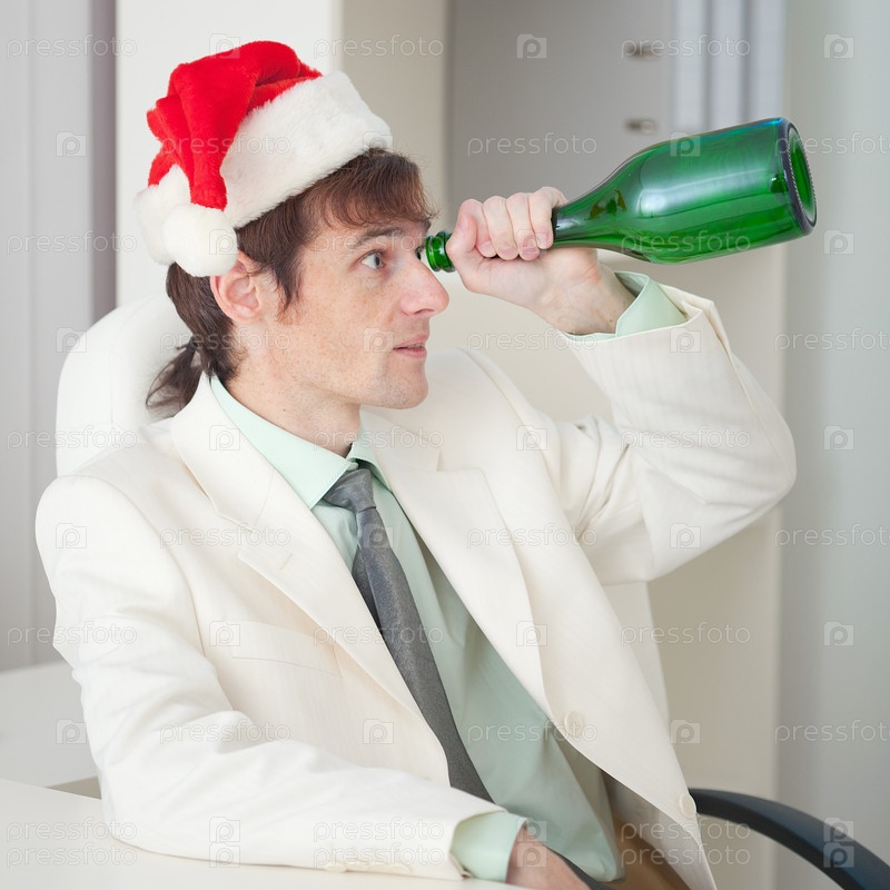 Пьяный молодой человек в рождественской шляпе заглядывает в пустую зеленую бутылку