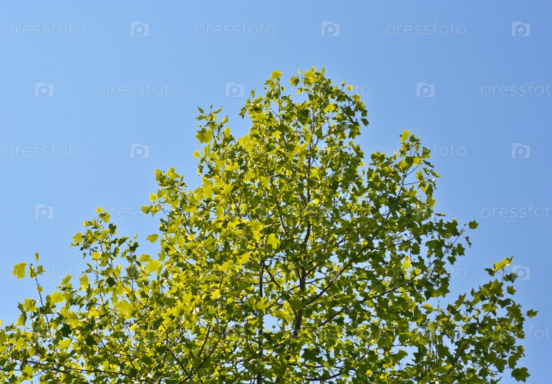 Крона молодого весеннего дерева на фоне голубого неба
