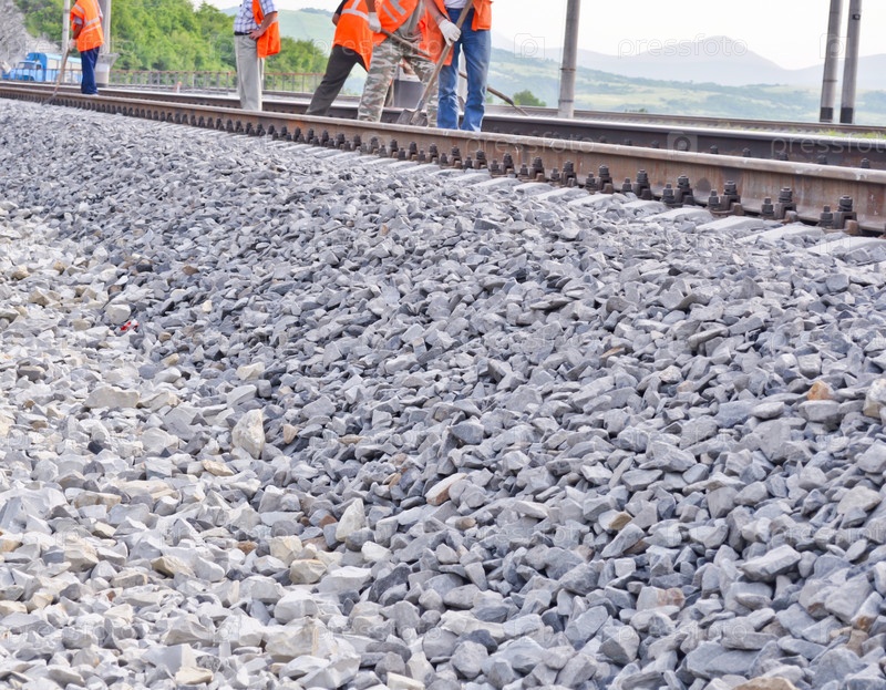 Рабочие в оранжевых жилетах на железнодорожной насыпи