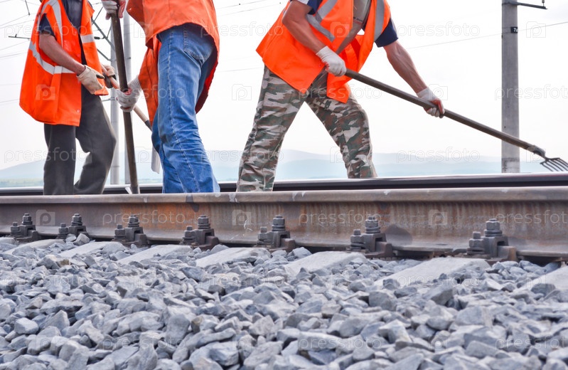 Рабочие в оранжевых жилетах на железнодорожной насыпи
