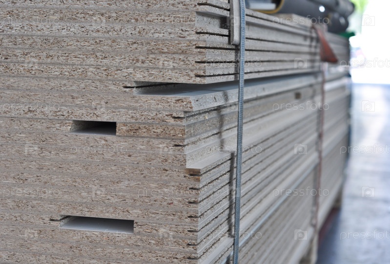 Штабель распиленной древесно-стружечной плиты крупным планом